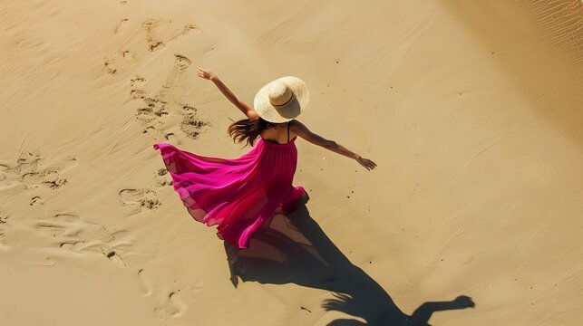 Aerial view of a beautiful young woman with a fuchsia long dress and a straw hat dancing with her shadow on the beach in a sunny morning in Calabria Italy : Generative AI