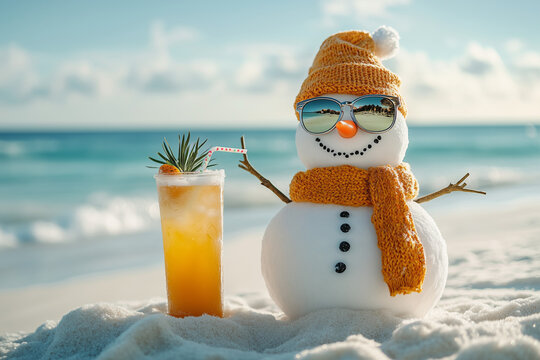 Straw hat with a exotic cocktail and sunglasses on sand beach