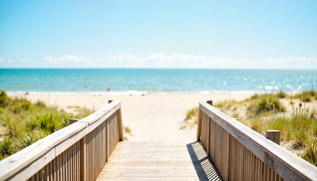 Pathway through sand dunes leading to sunny beach with clear blue sky and ocean.