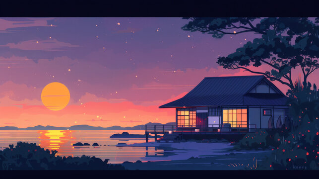 a beautiful japanese house at sea water in the late evening. anime cartoonish artstyle. cozy lofi asian architecture. sunrise in the morning