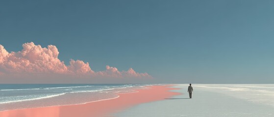 Lone figure silhouette on a reflective beach watching the sunset. Contemplation and personal journey concept. Mindfulness in nature for mental wellness. Facing the future with hope and calm