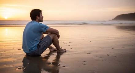 Person silhouetted against sunset beach view. Perfect for meditation, self-reflection, and peaceful solitude concepts.
