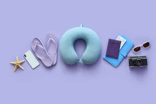 Composition with photo camera, mobile phone and beach accessories on lilac background
