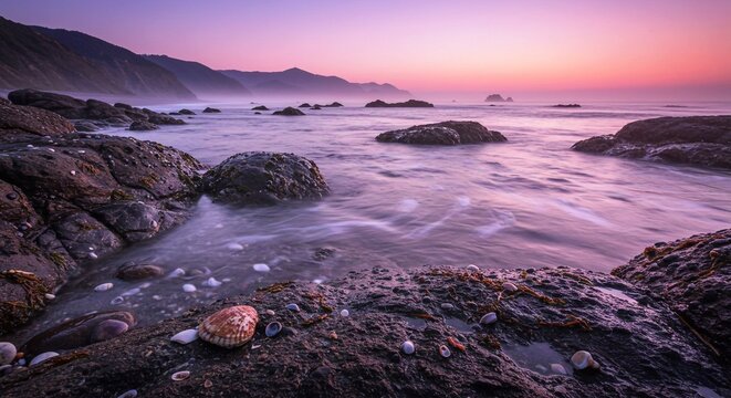 A soothing lilac sunset over the ocean with a stunning background