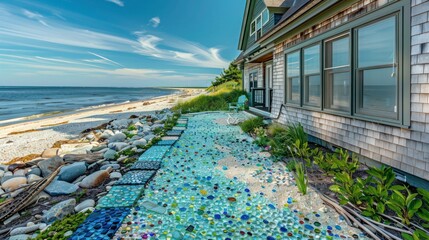 Suburban Cape Cod home with a sea glass mosaic walkway leading to the beach, handcrafted from pieces collected along the shore