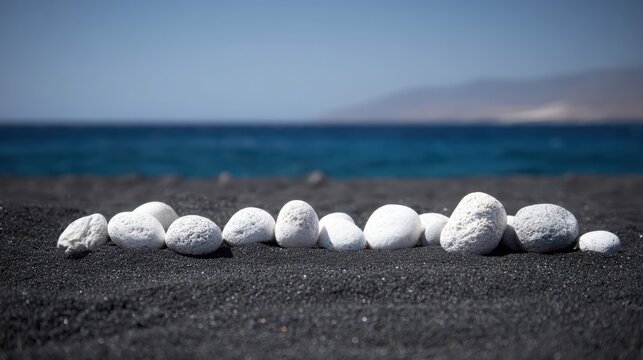 A Line of Smooth White Sea Pebbles Resting on Dark Beach Sand with a Blue Ocean and Hazy Mountains in the Background