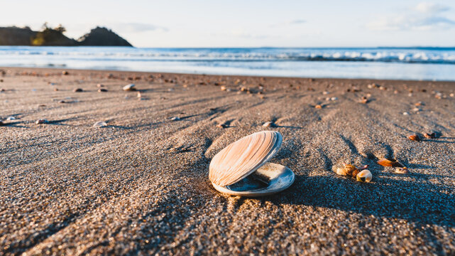Beautiful shot of a shell on the beach in New Chums Beach near  the sea in New Zealand with blue sky