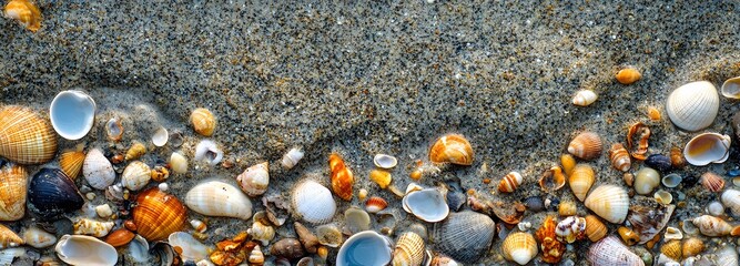 Glistening seashell cluster on wet sand with sea glass and water droplets macro beach texture