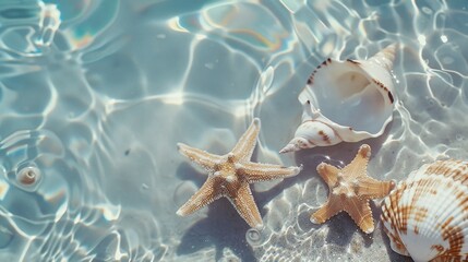 Starfish and seashell rest in the shimmering shallow waters, casting gentle shadows on the sandy ocean floor.