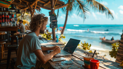 handsome businessman relaxing in a summer holiday, sitting on a beach resort table and working with laptop computer, beautiful beach background and evening vibes