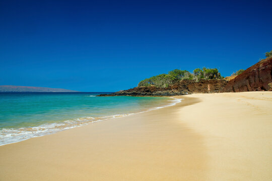 Panoramic view of white sandy beach with turquoise waters and lush greenery
