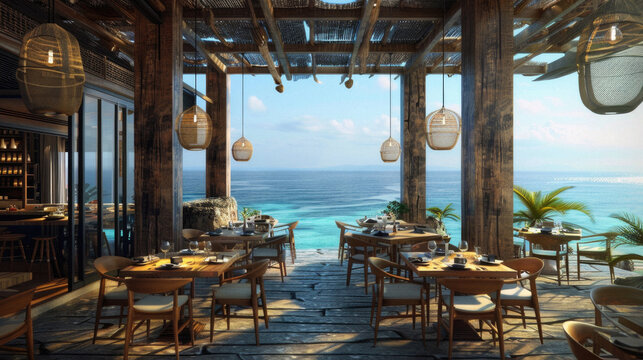 Beachfront restaurant with ocean view, sunny daytime. Empty tables chairs, design, decor. Tropical resort, vacation cafe. Interior dining room, panoramic windows overlooking ocean. Concept of travel