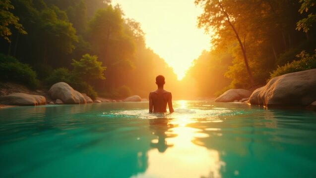 A breathtaking sunset scene with clear turquoise water, rocky cliffs, and palm trees on a tropical island, generate AI
