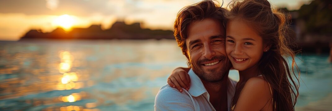 Father-daughter laughter: Sunset beach embrace