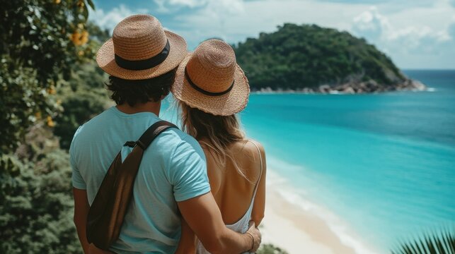Couple relaxing on beach hammock enjoying scenic view