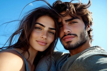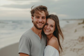 Young couple embracing on a beachside location with soft ocean breeze and golden sunlight casting a romantic warm glow on their faces