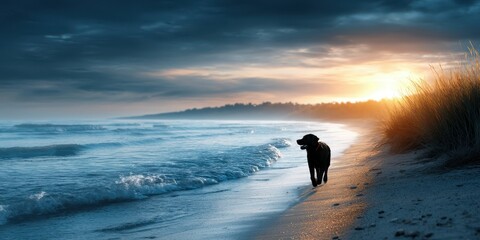 Serene beach sunset walk, ocean waves, sandy shore, vacation vibe, golden hour, tranquil seascape.