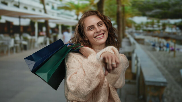 Woman wearing red clogs with flower walking on beachside path at sunset