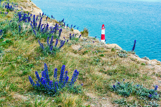 View of the beachy head lighthouse near Eastbourne, England, Seven Sisters National Park, UK, selective focus
