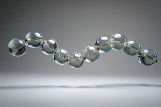Transparent glass bead chain suspended in air forming elegant smooth catenary curve with soft shadows