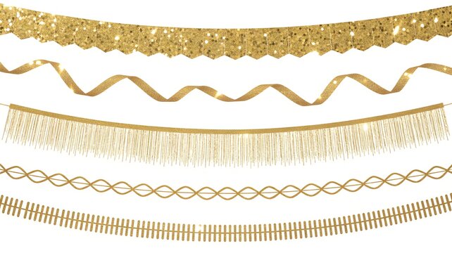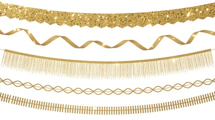 Collection of five decorative gold trim ribbons with intricate patterns and textures on a white background for crafting and embellishment