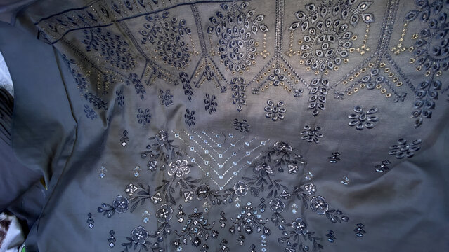 Detailed view of a gray fabric with ornate embroidery and bead embellishments