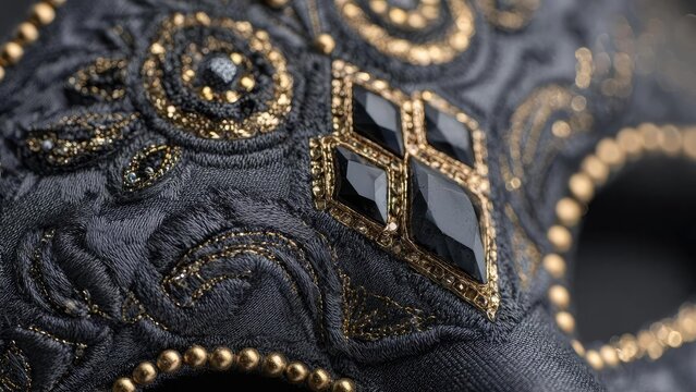 Close-up of a dark fabric clutch with gold bead embroidery and large black gemstone accents. Concept Close-up Detail, Embroidered Clutch, Gold Bead Embroidery, Large Black Gemstone Accents