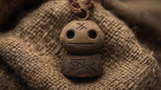 Rusty bead pendant shaped like a round-headed figure with two eye holes and a straight mouth, carved with runes, resting on burlap. Concept Rusty bead pendant, Round-headed figure, Runic carving