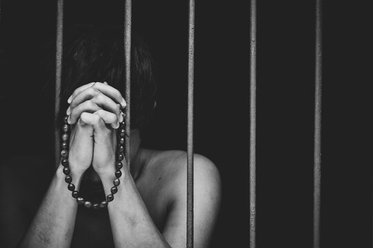 prison male inmate in prison with bead in hand raises his hand to make a wish and pray on black background.concept for prisoner,sadness,detain,erroneousness