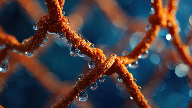Frozen texture of a netting with waterdrops against a bokeh background