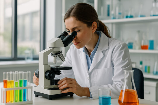 A scientist using a microscope in a laboratory, clean research lab with test tubes and beakers in the background, High-tech style