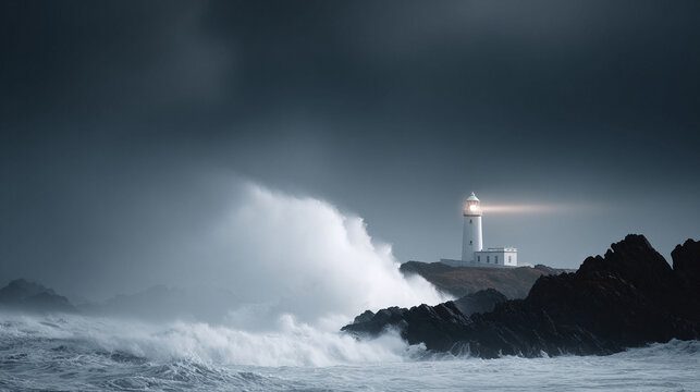 Dramatic coastal scene featuring a lighthouse beam cutting through a stormy sea. Symbolizes guidance, resilience, and hope. Ideal for illustrating perseverance and overcoming challenges.