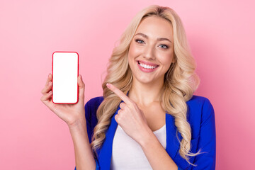 Photo of lovely nice lady beaming smile indicate finger empty space isolated on blue color background