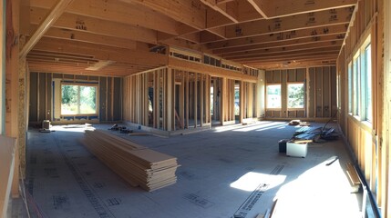 A view capturing the interplay of light and shadow on the smooth surface of freshly sanded joists highlighting their robustness. The fine dust from sanding settles lightly on the