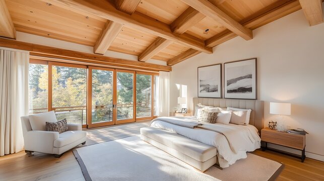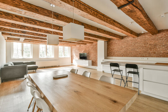 Elegant and spacious open concept interior rooms new construction with concrete floors designer decor wood beams on ceiling classic style