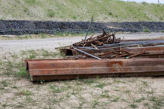 Pile of rusty metal beams and pipes lying on sandy ground at outdoor construction site