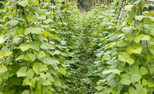 Green bean pods plantation. Fresh green beans growing on a plant in a vegetable garden