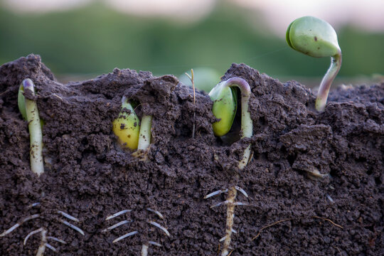 Sprouted soybean shoots in soil with roots. Blurred background.