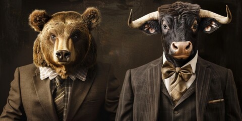 Bull versus bear in suits facing each other, trading on stock market. Bullish vs bearish trend