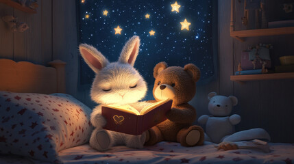 Soft plush toys teddy bear bunny on shelf with star lights nursery decor