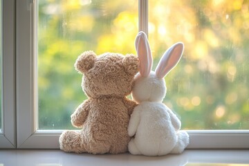 Stuffed toys by the window Cute teddy bear and rabbit are watching the outside