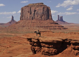 Viewpoint John Ford's Point, tourist on horseback, East Mitten Butte, West Mitten Butte, Merrick Butte, Castle Butte, Bear and Rabbit, Stagecoach, Mitchell Mesa table mountains, Monument Valley Navajo Tribal Park, Navajo Nation Reservation, Arizona, Utah, United States of America