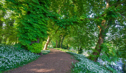 The first shoots of wild garlic appear in early spring. The growth of young Ramson wild leek Barlauch in Potzleinsdorfer Schlosspark in Vienna