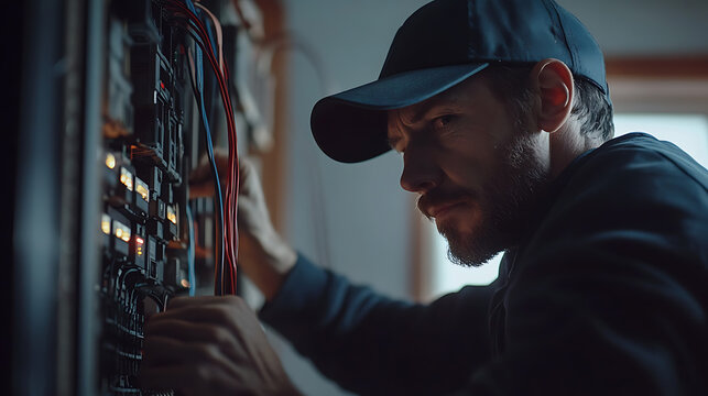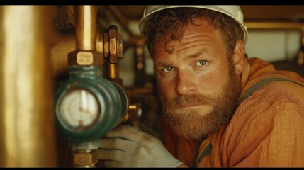 Technician chef repairs industrial oven in modern commercial kitchen. Man in uniform, gloves, checks oven door. Maintenance service, food preparation, restaurant tech.