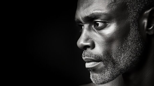 Black and white portrait of a pensive middle-aged Black man against a dark background.