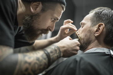 Trimming beard in barbershop