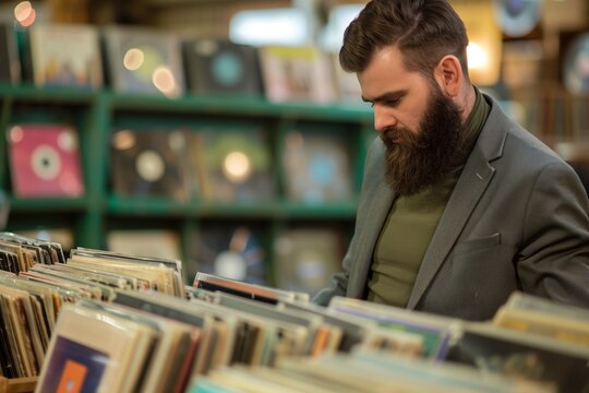 bearded individual in a blazer browsing vinyl records