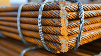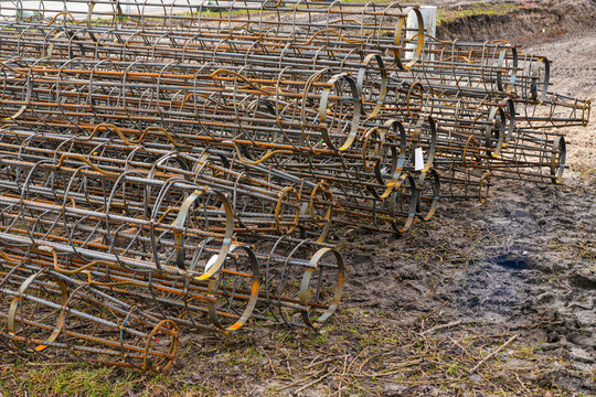 Steel rebar cages stacked on construction site for bored pile foundation and concrete reinforcement