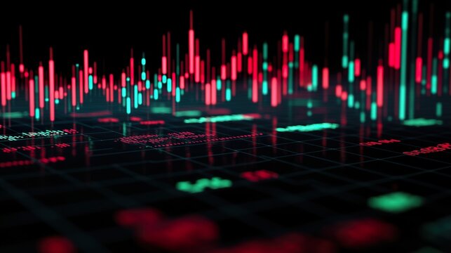 Visualizing global financial data with neon magenta ribbons and candlestick charts