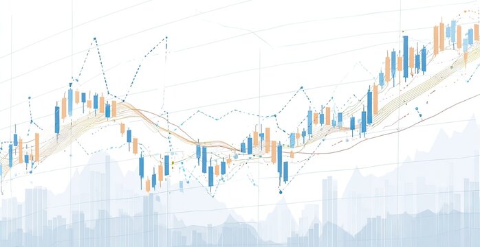 Abstract financial chart with candlestick patterns, trend lines, and city skyline silhouette, rendered in light blue and orange hues on a white background